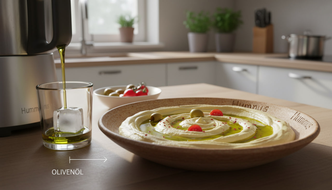 Der größte Fehler, den Deutsche beim Pürieren machen, liegt in der Flüssigkeit. Viele schütten das trübe Einweichwasser der Kichererbsen (das sogenannte Aquafaba) direkt mit in den Mixer (z. B. in den Thermomix oder Bosch-Blender).